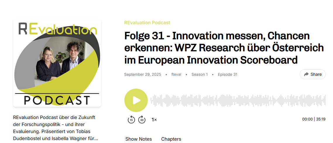 Der aktuelle fteval Podcast zu Forschungspolitik und ihrer Evaluierung mit dem Thema European Innovation Scoreboard (EIS) ist nun online: Folge 31. Brigitte Ecker und Sascha Sardadvar erklären in die...
